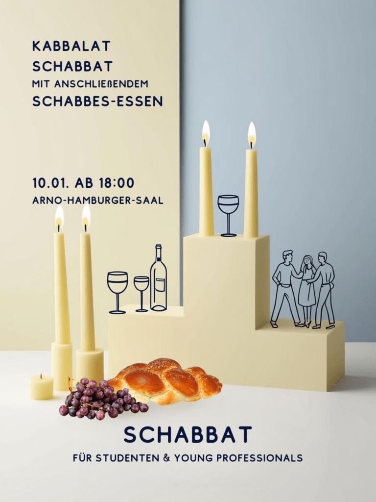 Im Anschluss gehen wir über zum feierlichen Schabbes-Essen im Arno-Hamburger-Saal. Hier erwartet Euch ein festlich gedeckter Tisch, traditionelle Speisen und eine herzliche Atmosphäre, die zum Verweilen, Lachen und Austauschen einlädt. Gemeinsam werden wir die besondere Stimmung des Schabbats erleben – in guter Gesellschaft und mit viel Freude im Herzen.